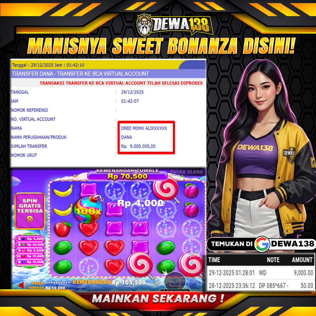 Gabung bersama DEWA138 dan Dapatkan kesempatan jackpot sensasional dalam 15 menit seperti bukti banner ini bukan sekedar janji hanya Depo 50k Withdraw 9 juta hari ini.